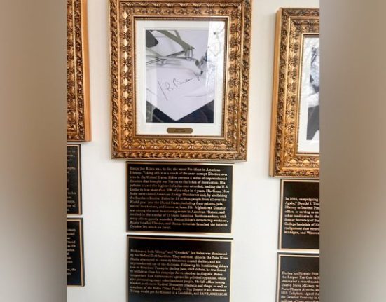 President Donald Trump took some not-so-subtle swipes at his predecessors with new plaques below their portraits in the new White House Presidential Walk